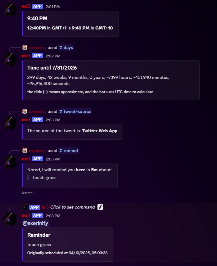 ex3 is an experimental discord bot with 70+ random commands. It's quite versatile, and has just the right mix of usefulness and uselessness.